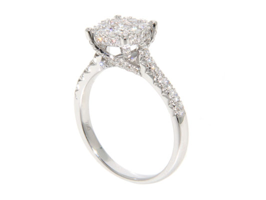 Anello in oro bianco 18 kt con diamante centrale ct 0,18 e diamanti contorno ct 0,51