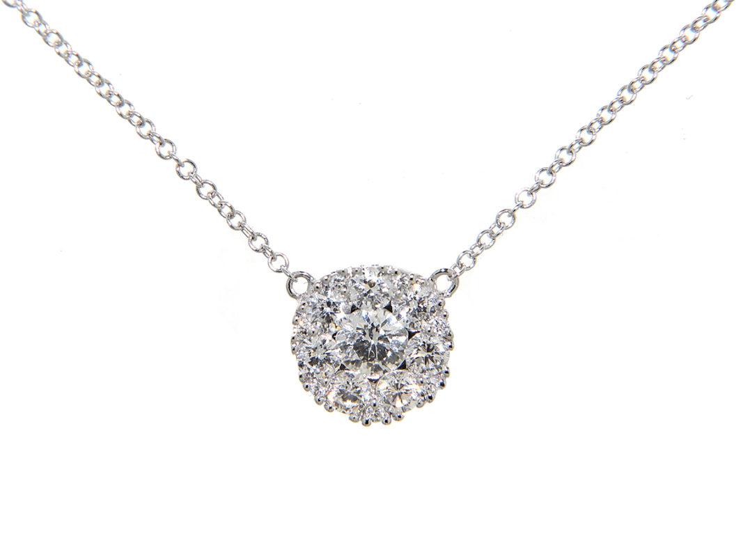 Pendente in oro bianco 18 kt con diamante centrale ct 0,20 e diam. contorno ct 0,49
