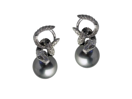 Orecchini in oro bianco 18 kt, diamanti bianchi e neri e perla Tahiti